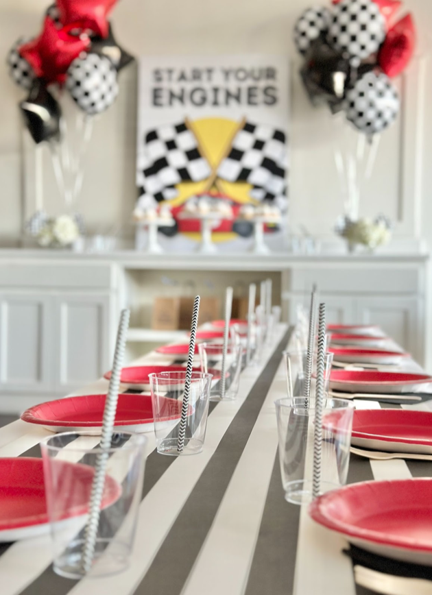 Paper goods: dessert plates, napkins, cups, and striped straws